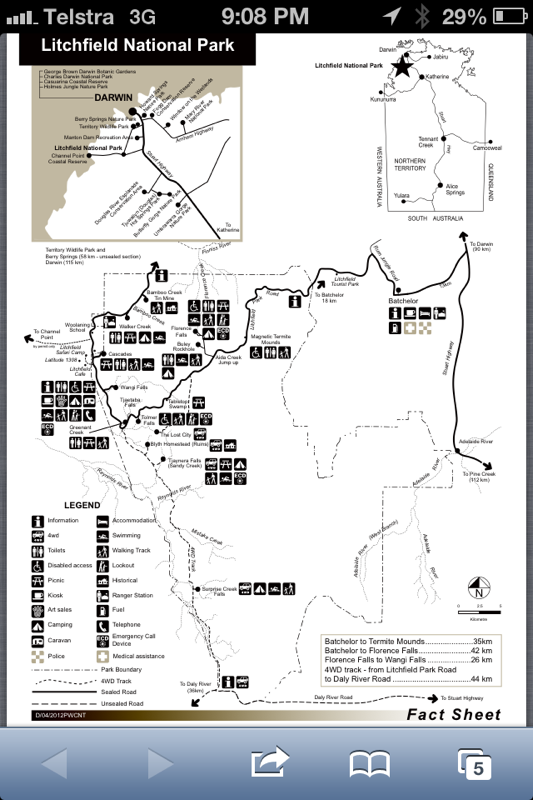 We both had the day off work yesterday (Thursday 26 Sept) and spent the day traveling through Litchfield National Park. Great sites, good swimming holes and very accessible from where we are staying. I’m still not quite sure how the crocodiles know where the “designated swimming holes” are so they can keep out, but neither of us have been eaten yet. There is a highway through Litchfield, but Peter being Peter just had to take us off the beaten track – through the water, with the croc warning signs, to the middle of nowhere. I suppose that’s why you have a 4WD. Took lots of pics and I will put them in as Litchfield National Park.