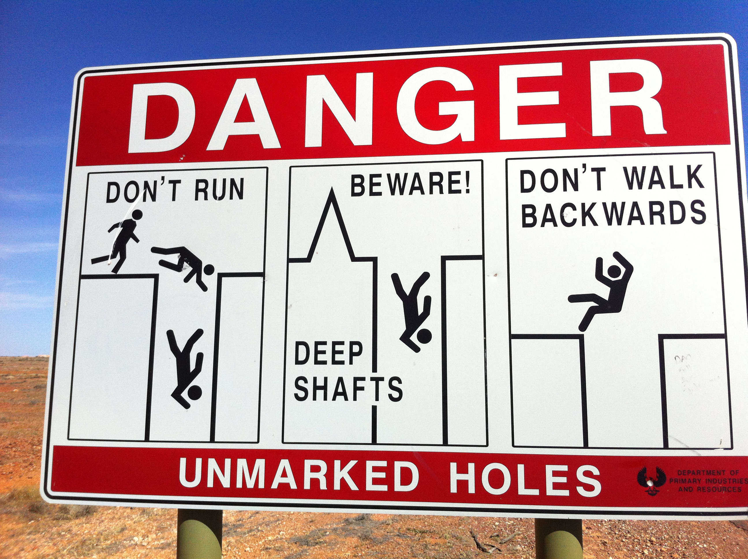Our first stop in SA was Coober Pedy. Driving into the area was like entering a giant sand pit. There were literally holes everywhere, I don’t think there is a square inch of the town that has not been dug up at least once. The signs posted everywhere are evidence of this.
