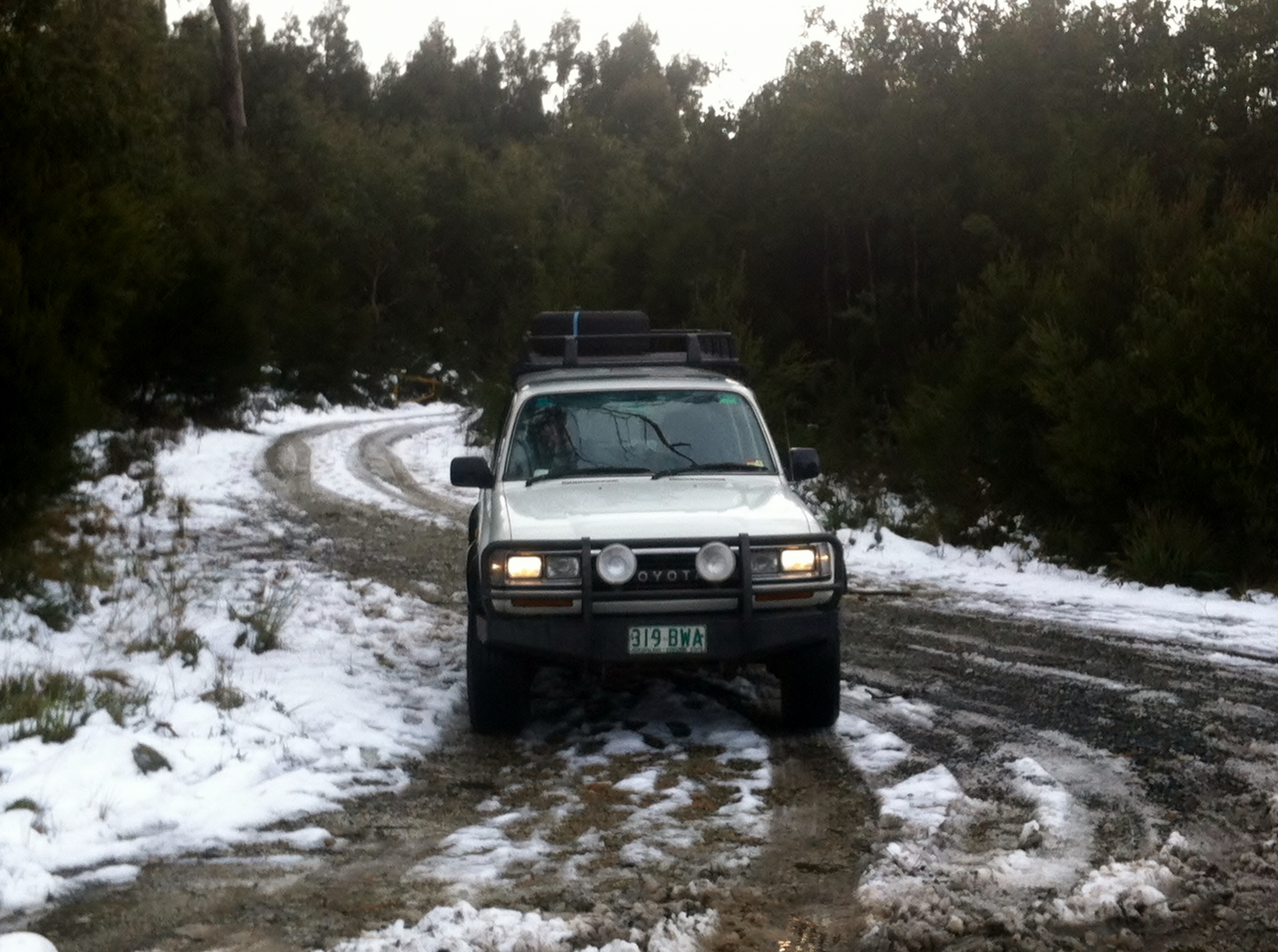 This morning we went for a drive up into the mountains back to Waratah to check out the snow. It was only about a couple of feet deep in most places, but for us Queenslanders fairly impressive. Bessy just loved it. Who would have thought that a girl from “The Alice” would like snow so much – maybe she is a alpine dingo after all.