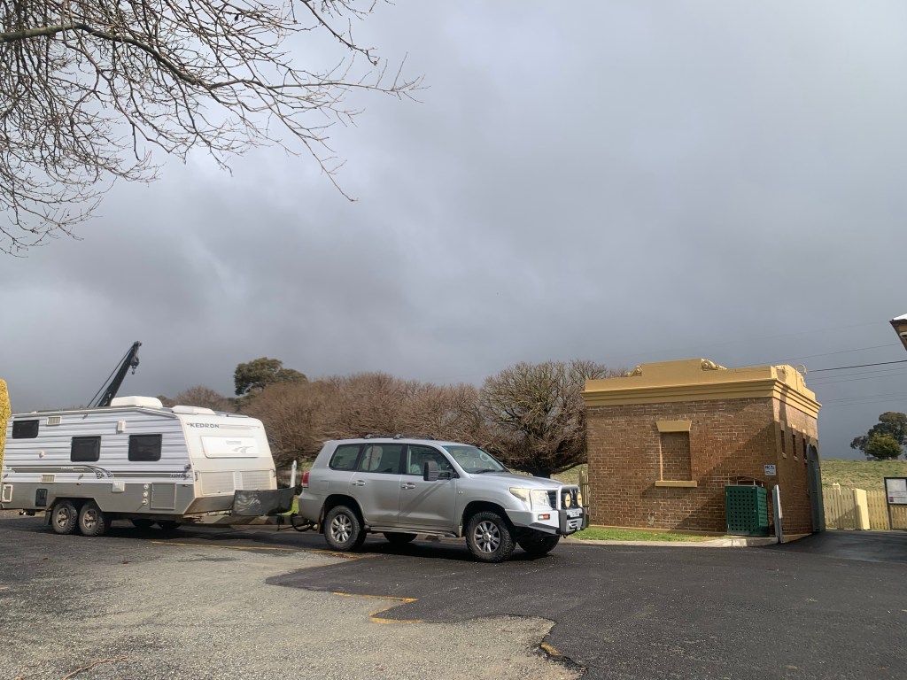 We decided to take the proverbial road less travelled when we first left Canberra. We did not take any of the highways but instead drove through – or should I say- up and down and around lots and lots of very steep, sharp bends through the Mundoonen Ranges. I would not recommend this way to anyone towing a van unless they have power to spare in their car. To make things even more interesting it was windy and wet with a top temperature of 5 degrees